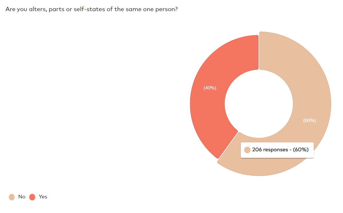 2024 Plural Census data shows that over half (60%) of 343 respondents do not identify as being ‘parts’ or ‘self-states’ of one person, challenging clinical assumptions about identity in plurality (see figure below). This finding underscores the need to broaden our perspective on what plurality can be—well beyond restrictive medical definitions or assumptions.
